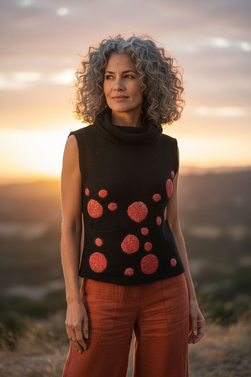 Camiseta artesanal confeccionada a mano, inspirada en formas circulares y equilibrios orgánicos. Elaborada en lana, seda y viscosa, destaca por su ligereza, suavidad y confort natural. Se realiza bajo encargo, permitiendo la selección de diferentes colores, lo que convierte cada prenda en una pieza singular.