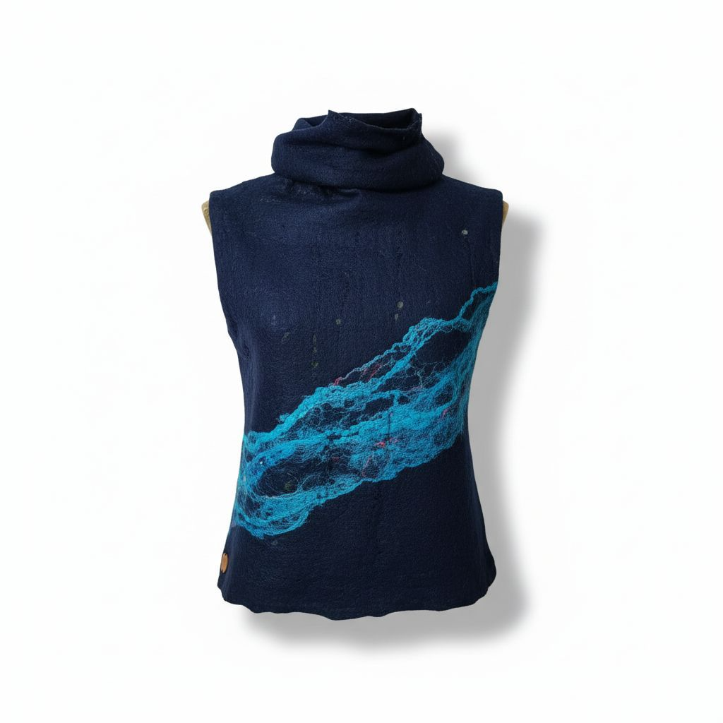 Top de cuello alto ,artesanal confeccionada a mano. Elaborada en lana, seda y viscosa, destaca por su ligereza, suavidad y confort natural. Se realiza bajo encargo, permitiendo la selección de diferentes colores, lo que convierte cada prenda en una pieza singular.